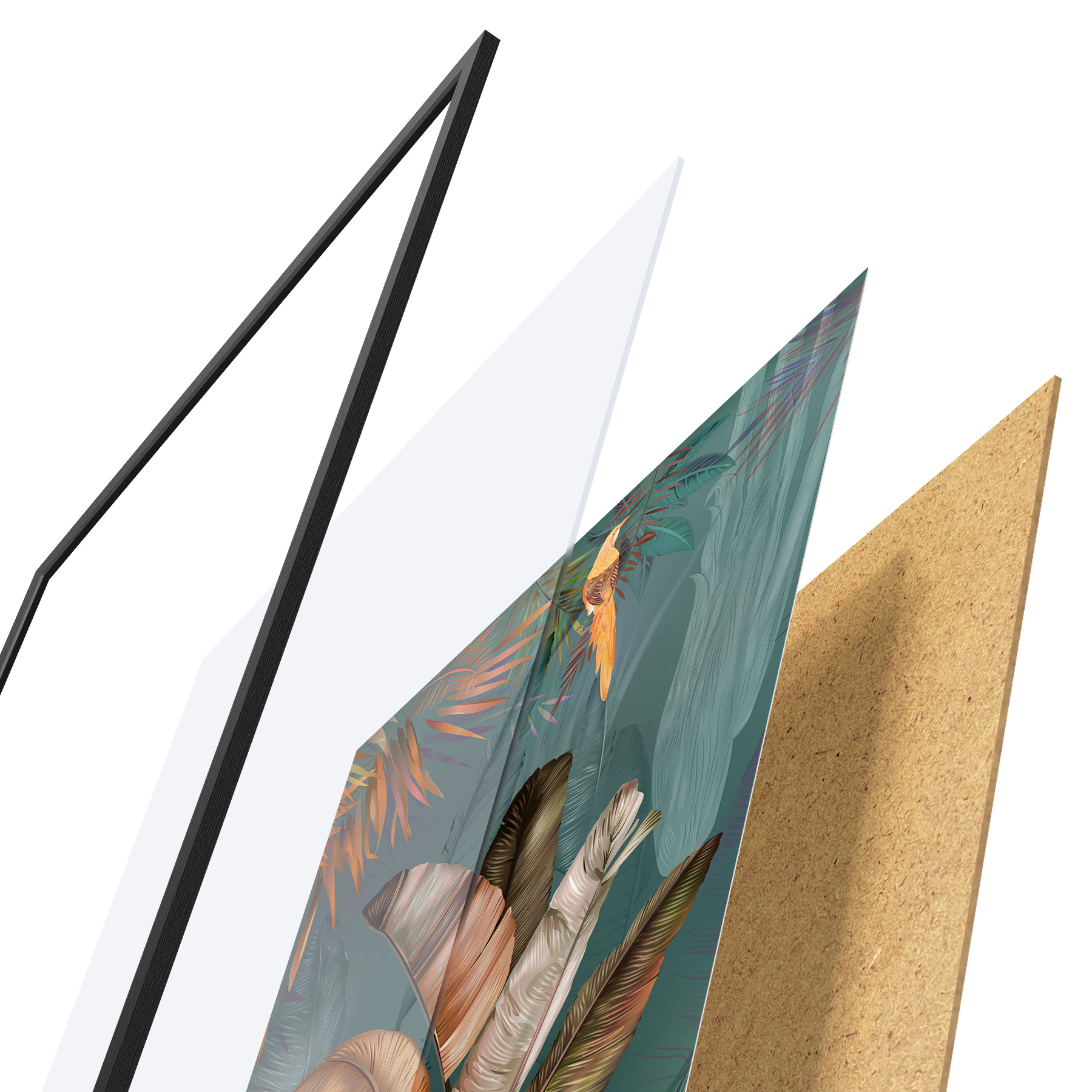 El póster consta de marco, plexiglás, imagen impresa y soporte de aglomerado. El póster puede colgarse inmediatamente en la pared gracias a los soportes de la parte posterior.