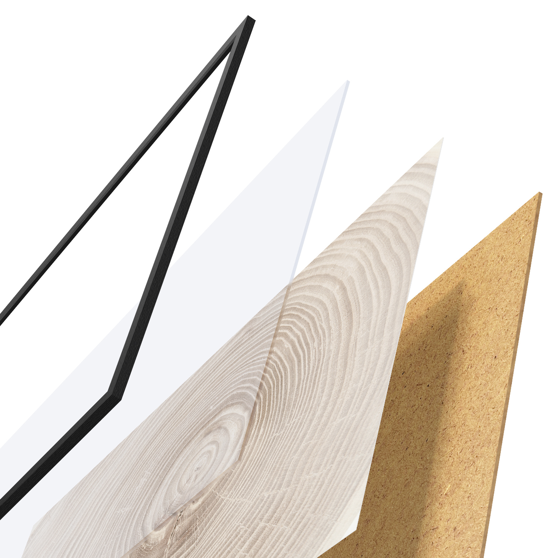 El póster consta de marco, plexiglás, imagen impresa y soporte de aglomerado. El póster puede colgarse inmediatamente en la pared gracias a los soportes de la parte posterior.