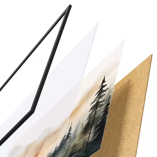 El póster consta de marco, plexiglás, imagen impresa y soporte de aglomerado. El póster puede colgarse inmediatamente en la pared gracias a los soportes de la parte posterior.