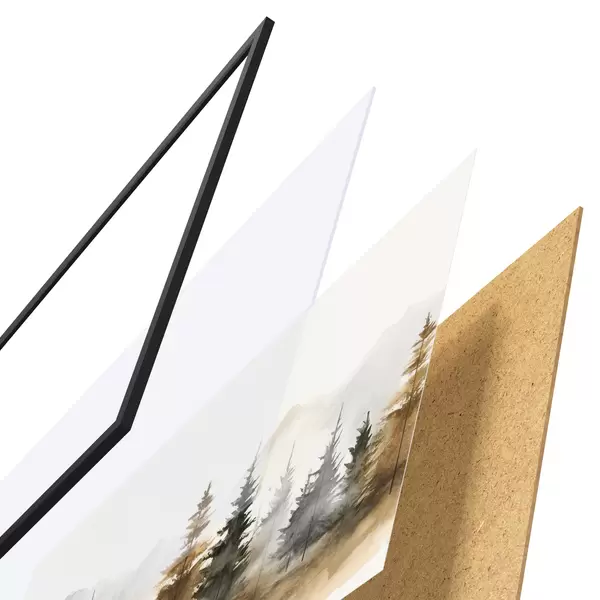 El póster consta de marco, plexiglás, imagen impresa y soporte de aglomerado. El póster puede colgarse inmediatamente en la pared gracias a los soportes de la parte posterior.