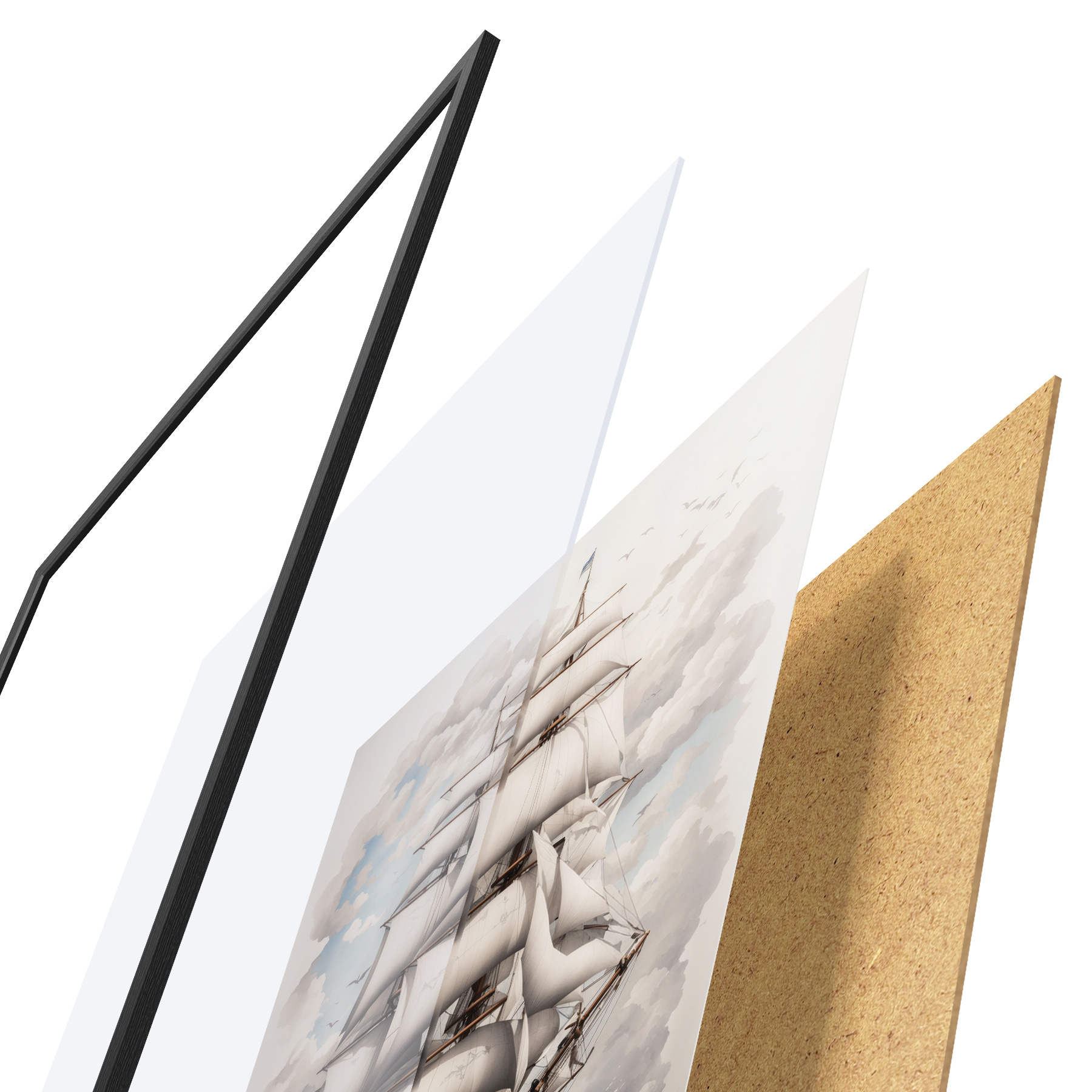 El póster consta de marco, plexiglás, imagen impresa y soporte de aglomerado. El póster puede colgarse inmediatamente en la pared gracias a los soportes de la parte posterior.