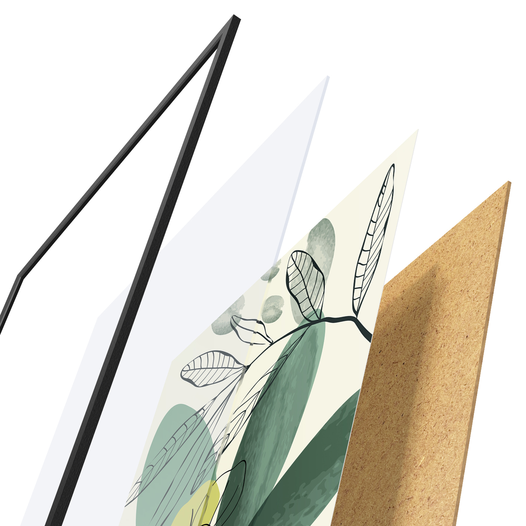 El póster consta de marco, plexiglás, imagen impresa y soporte de aglomerado. El póster puede colgarse inmediatamente en la pared gracias a los soportes de la parte posterior.