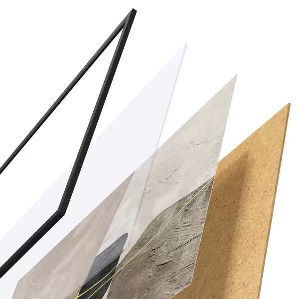 El póster consta de marco, plexiglás, imagen impresa y soporte de aglomerado. El póster puede colgarse inmediatamente en la pared gracias a los soportes de la parte posterior.