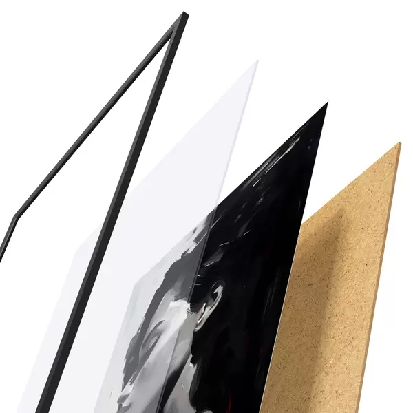 El póster consta de marco, plexiglás, imagen impresa y soporte de aglomerado. El póster puede colgarse inmediatamente en la pared gracias a los soportes de la parte posterior.