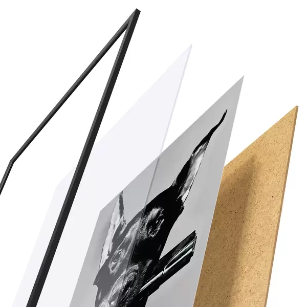 El póster consta de marco, plexiglás, imagen impresa y soporte de aglomerado. El póster puede colgarse inmediatamente en la pared gracias a los soportes de la parte posterior.