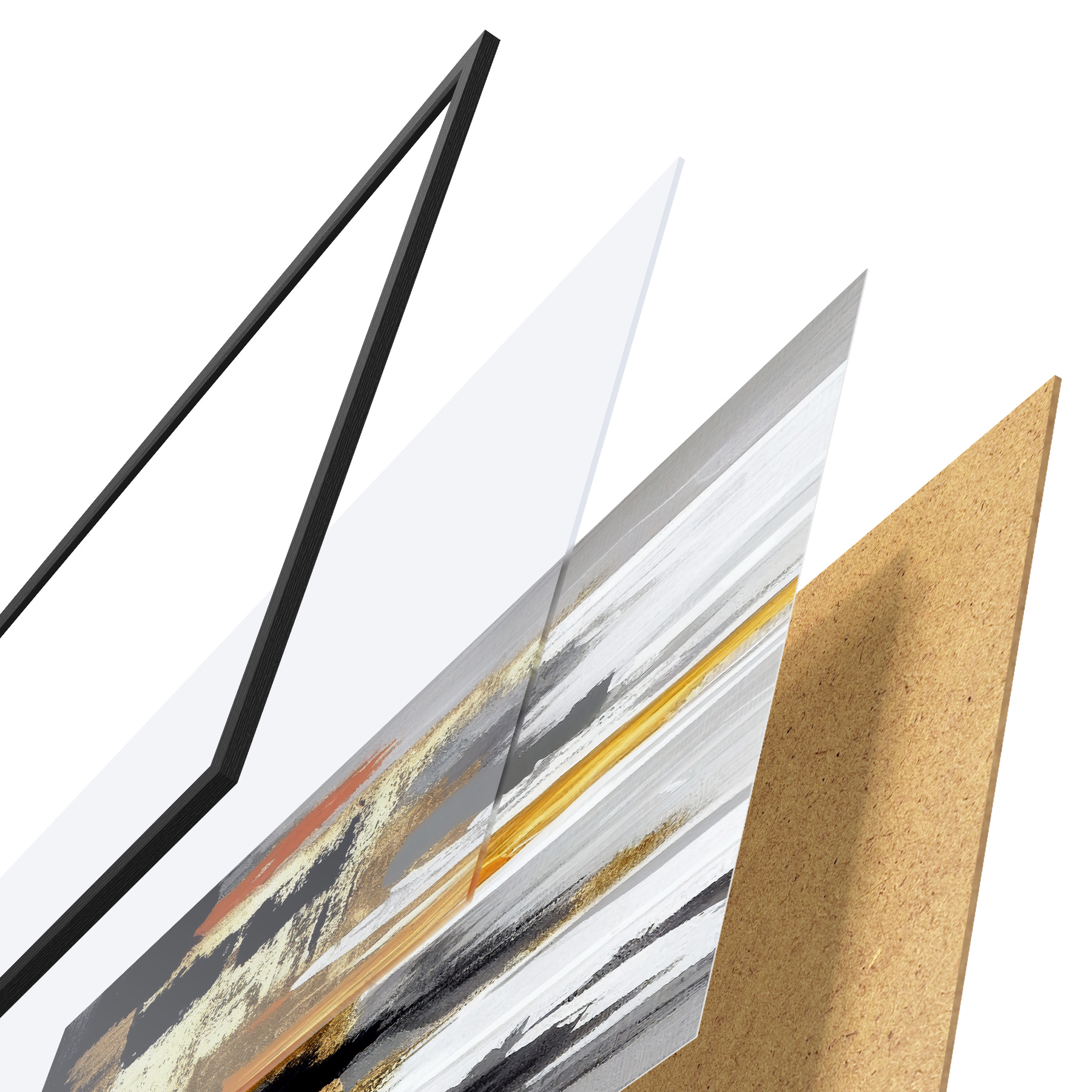 El póster consta de marco, plexiglás, imagen impresa y soporte de aglomerado. El póster puede colgarse inmediatamente en la pared gracias a los soportes de la parte posterior.