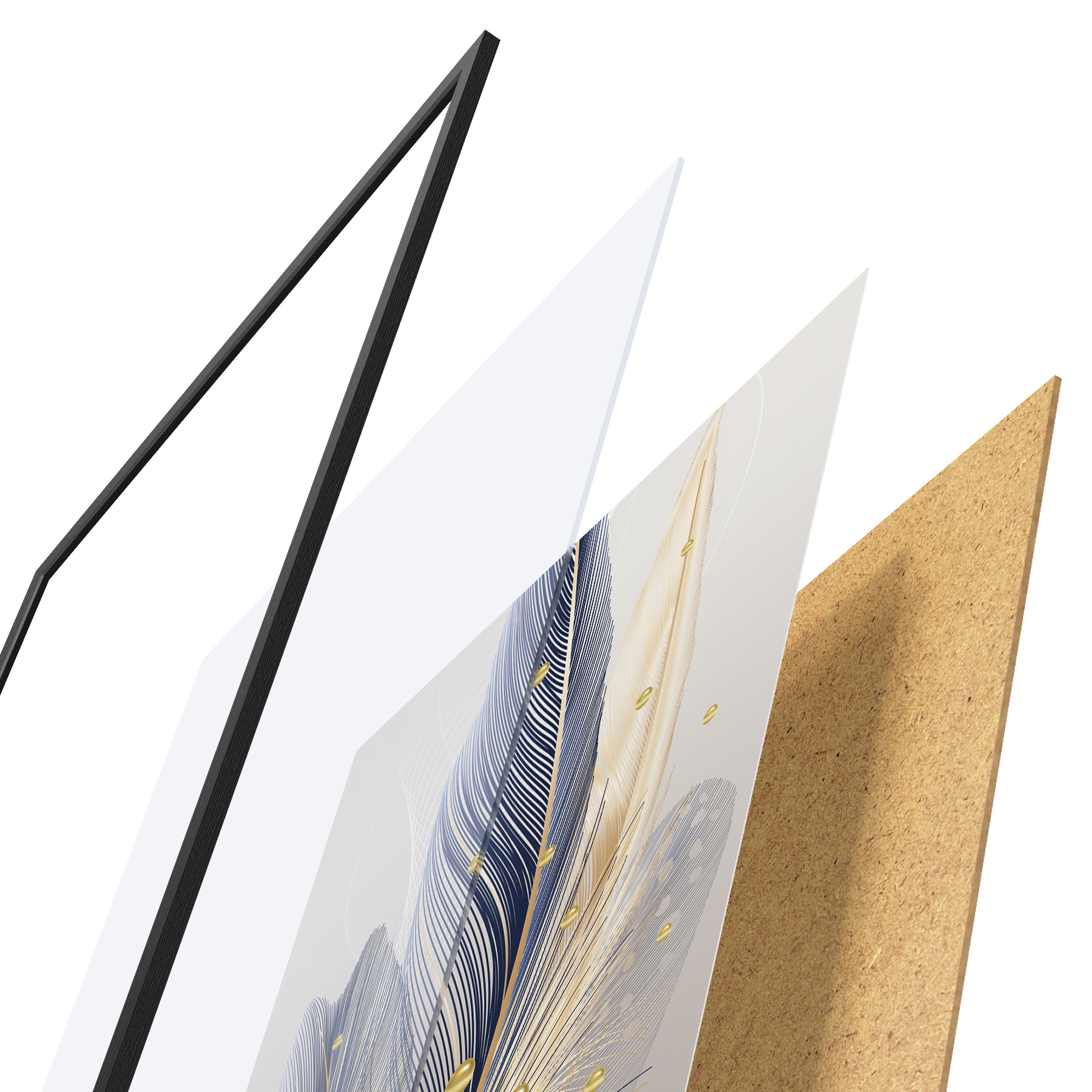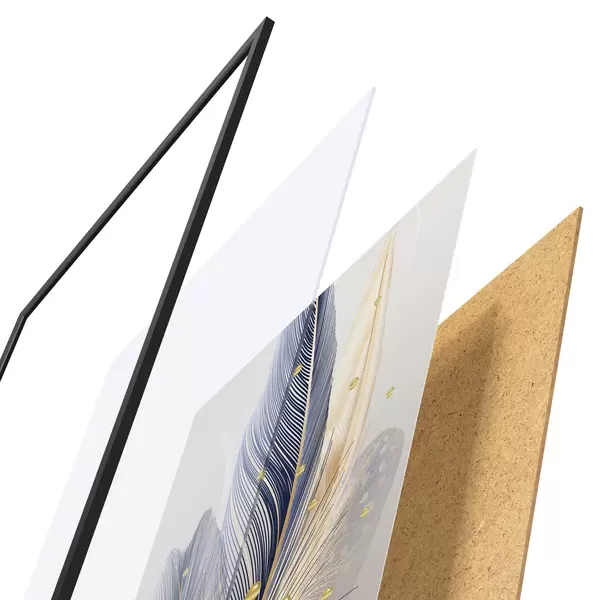 El póster consta de marco, plexiglás, imagen impresa y soporte de aglomerado. El póster puede colgarse inmediatamente en la pared gracias a los soportes de la parte posterior.