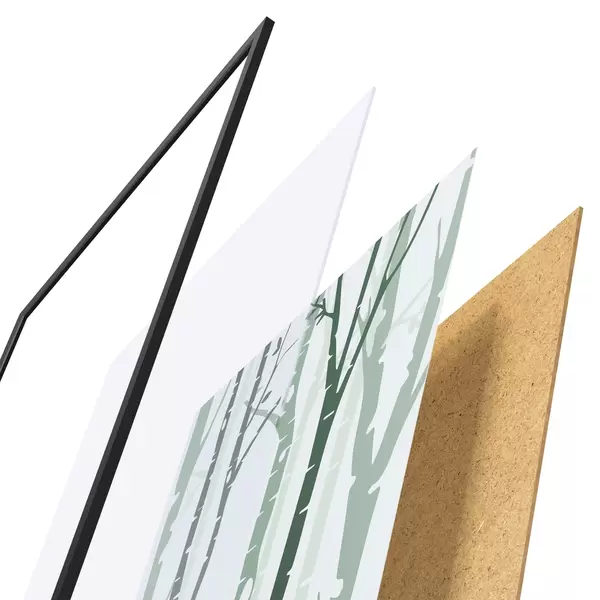 El póster consta de marco, plexiglás, imagen impresa y soporte de aglomerado. El póster puede colgarse inmediatamente en la pared gracias a los soportes de la parte posterior.