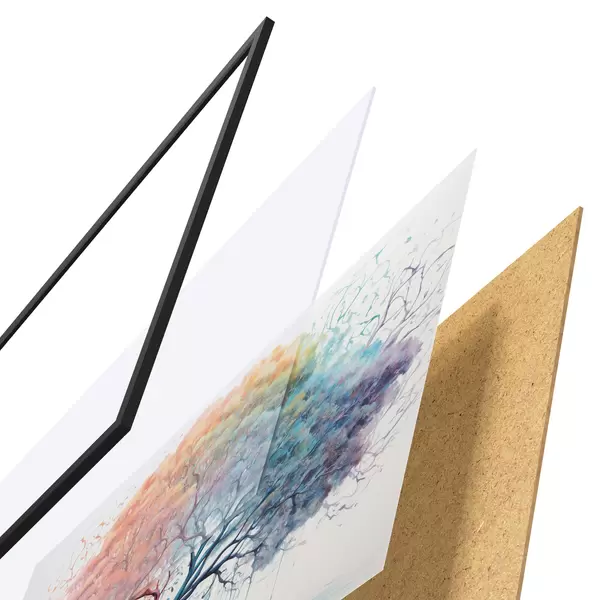 El póster consta de marco, plexiglás, imagen impresa y soporte de aglomerado. El póster puede colgarse inmediatamente en la pared gracias a los soportes de la parte posterior.