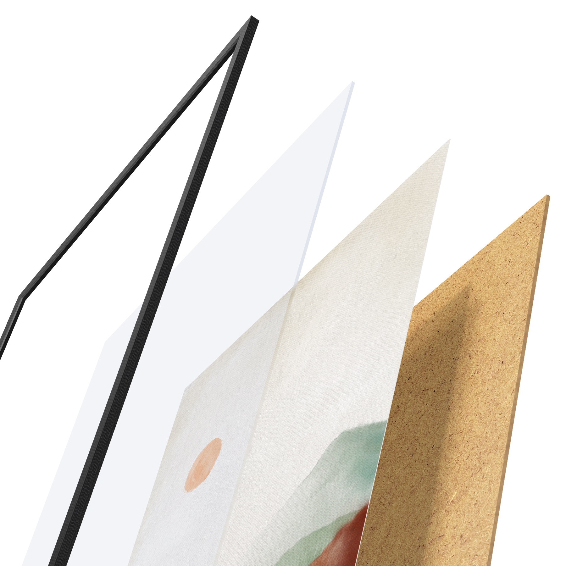 El póster consta de marco, plexiglás, imagen impresa y soporte de aglomerado. El póster puede colgarse inmediatamente en la pared gracias a los soportes de la parte posterior.