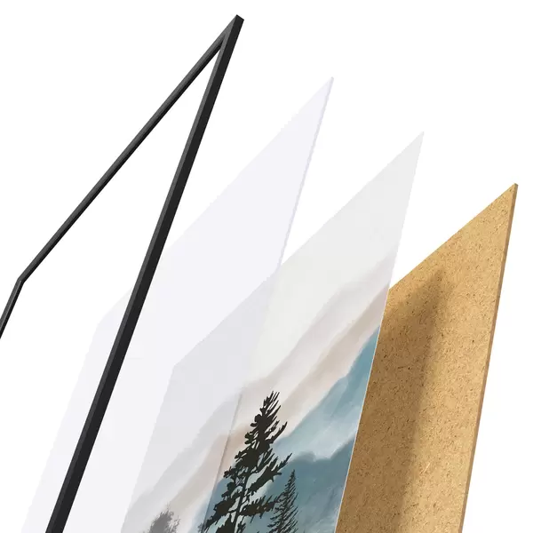 El póster consta de marco, plexiglás, imagen impresa y soporte de aglomerado. El póster puede colgarse inmediatamente en la pared gracias a los soportes de la parte posterior.