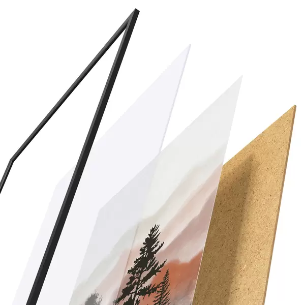 El póster consta de marco, plexiglás, imagen impresa y soporte de aglomerado. El póster puede colgarse inmediatamente en la pared gracias a los soportes de la parte posterior.