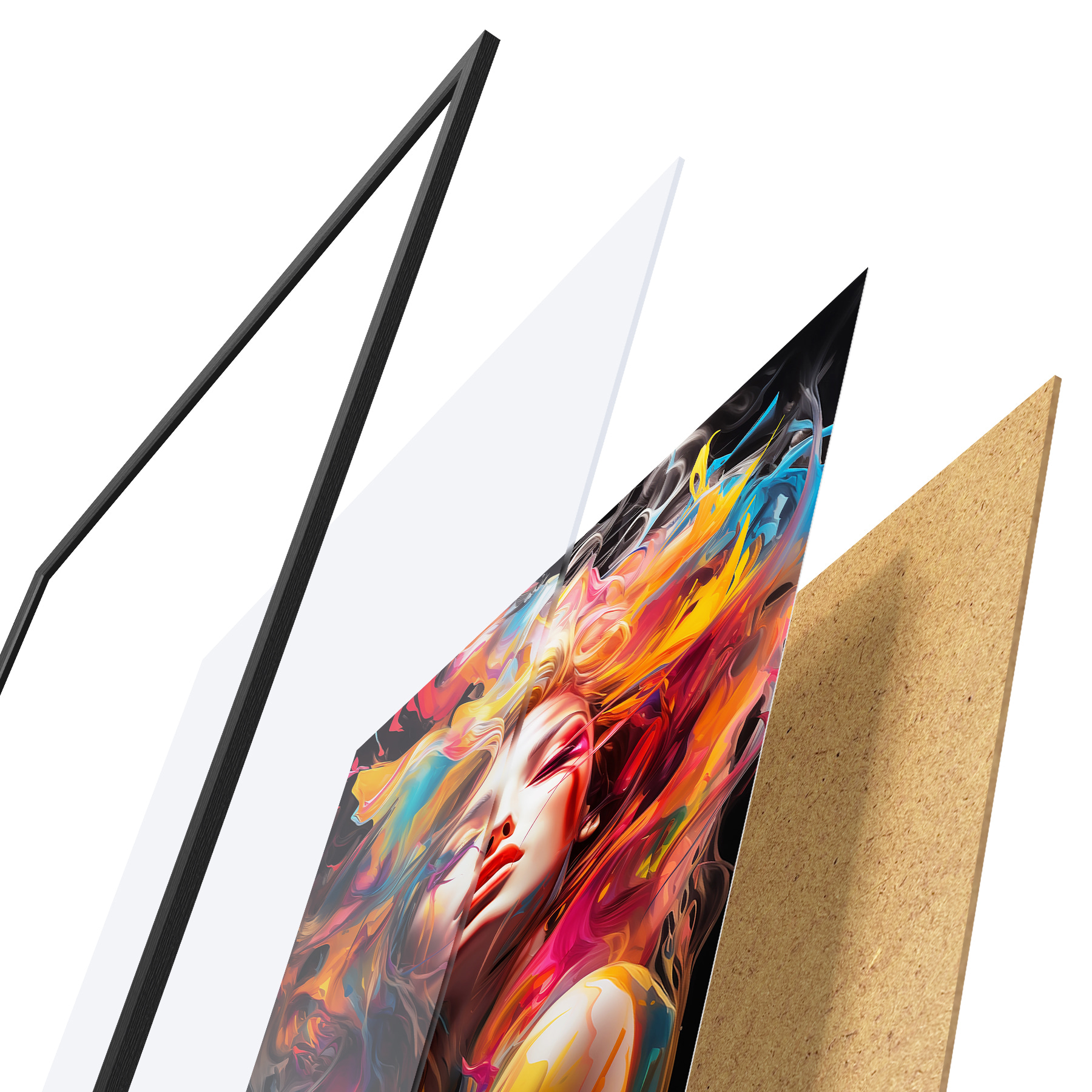 El póster consta de marco, plexiglás, imagen impresa y soporte de aglomerado. El póster puede colgarse inmediatamente en la pared gracias a los soportes de la parte posterior.