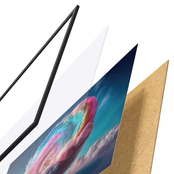 El póster consta de marco, plexiglás, imagen impresa y soporte de aglomerado. El póster puede colgarse inmediatamente en la pared gracias a los soportes de la parte posterior.