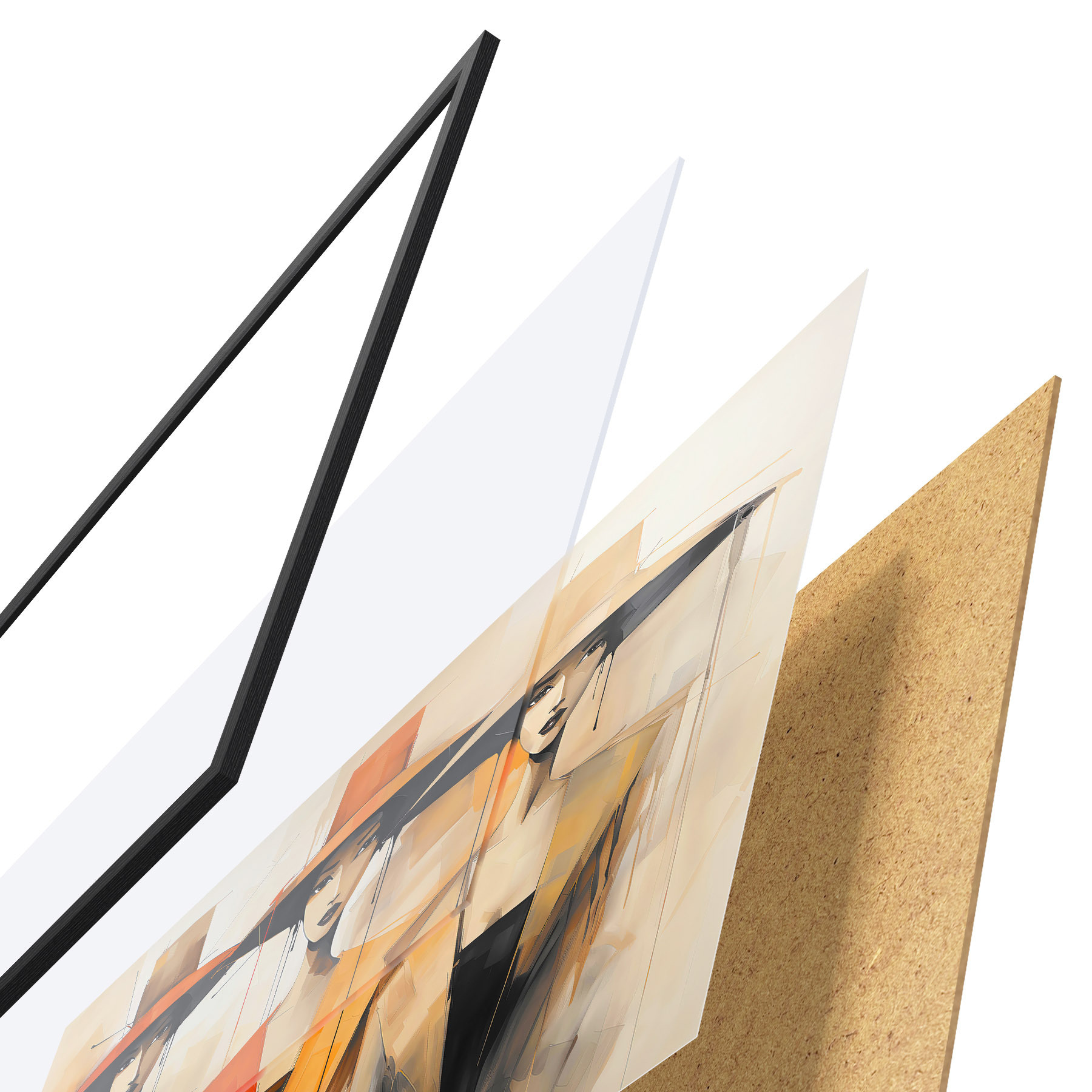 El póster consta de marco, plexiglás, imagen impresa y soporte de aglomerado. El póster puede colgarse inmediatamente en la pared gracias a los soportes de la parte posterior.