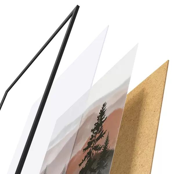 El póster consta de marco, plexiglás, imagen impresa y soporte de aglomerado. El póster puede colgarse inmediatamente en la pared gracias a los soportes de la parte posterior.