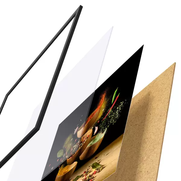El póster consta de marco, plexiglás, imagen impresa y soporte de aglomerado. El póster puede colgarse inmediatamente en la pared gracias a los soportes de la parte posterior.