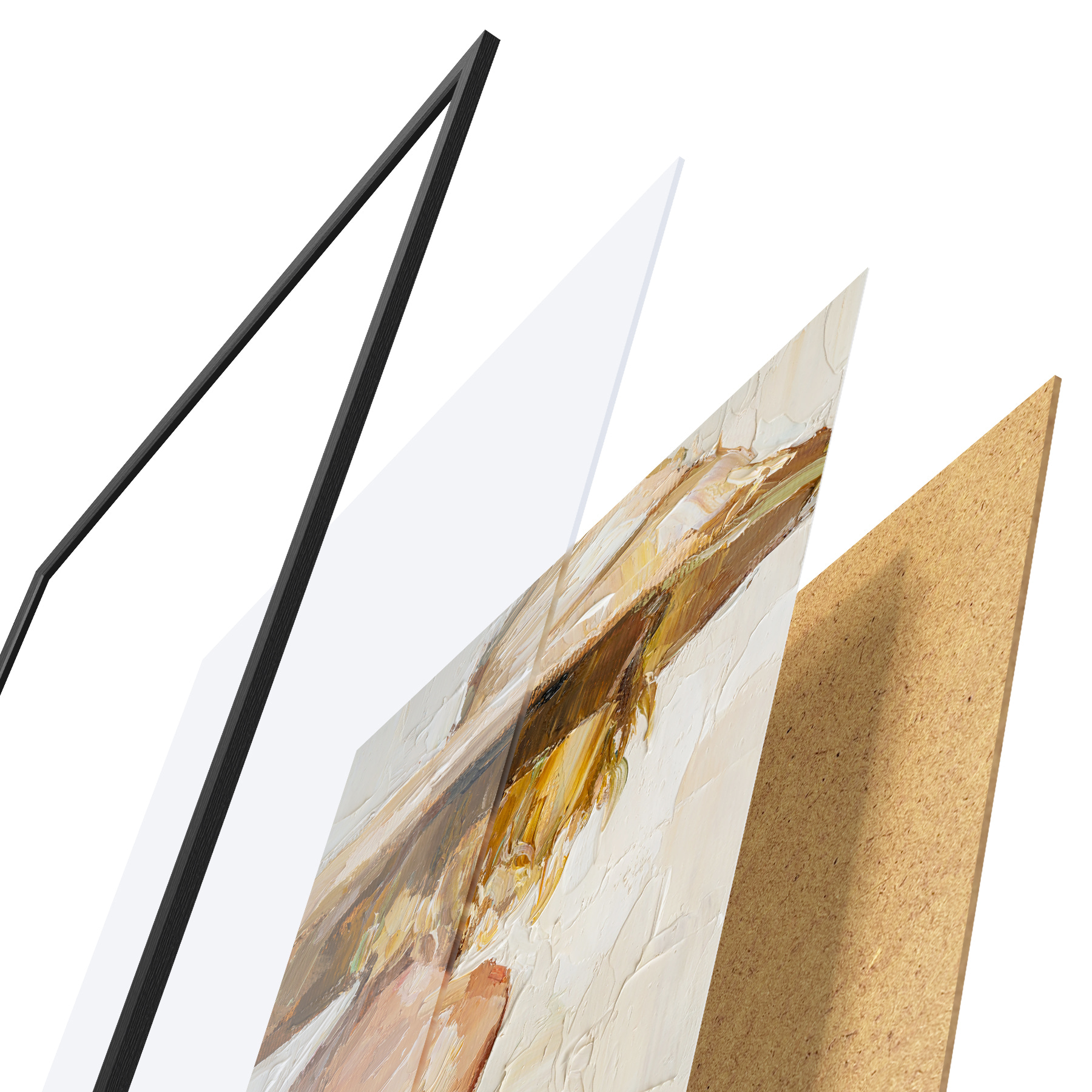 El póster consta de marco, plexiglás, imagen impresa y soporte de aglomerado. El póster puede colgarse inmediatamente en la pared gracias a los soportes de la parte posterior.