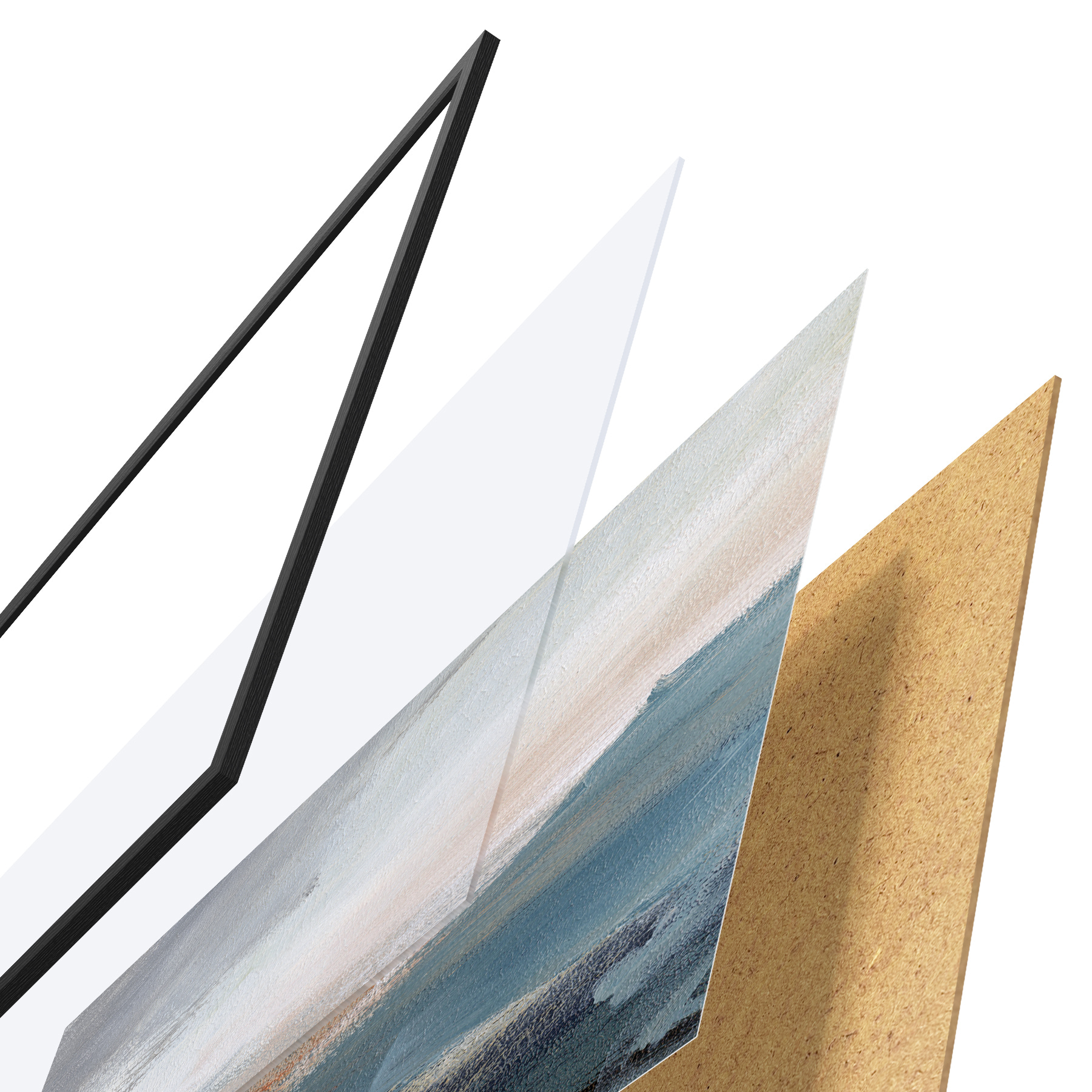 El póster consta de marco, plexiglás, imagen impresa y soporte de aglomerado. El póster puede colgarse inmediatamente en la pared gracias a los soportes de la parte posterior.
