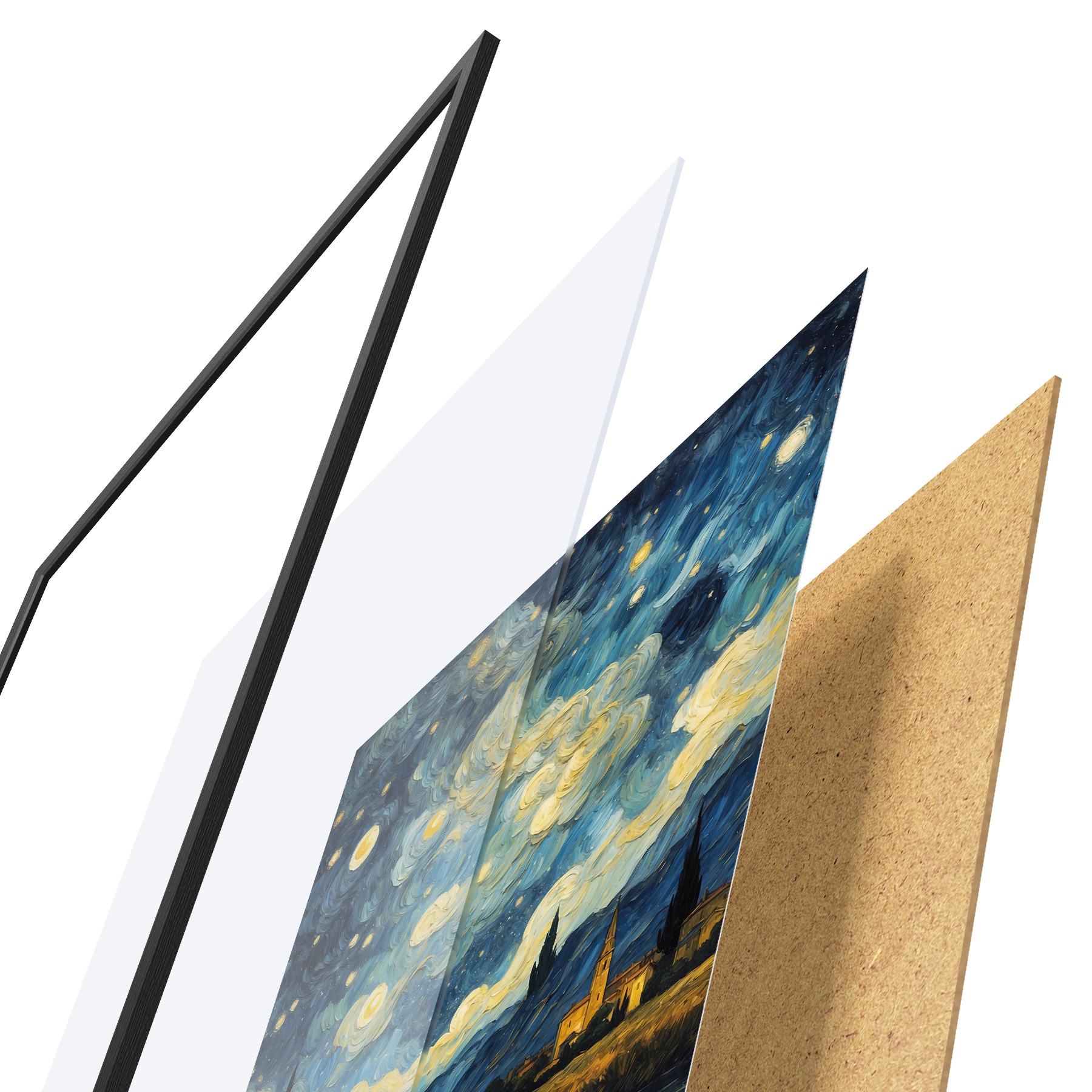El póster consta de marco, plexiglás, imagen impresa y soporte de aglomerado. El póster puede colgarse inmediatamente en la pared gracias a los soportes de la parte posterior.