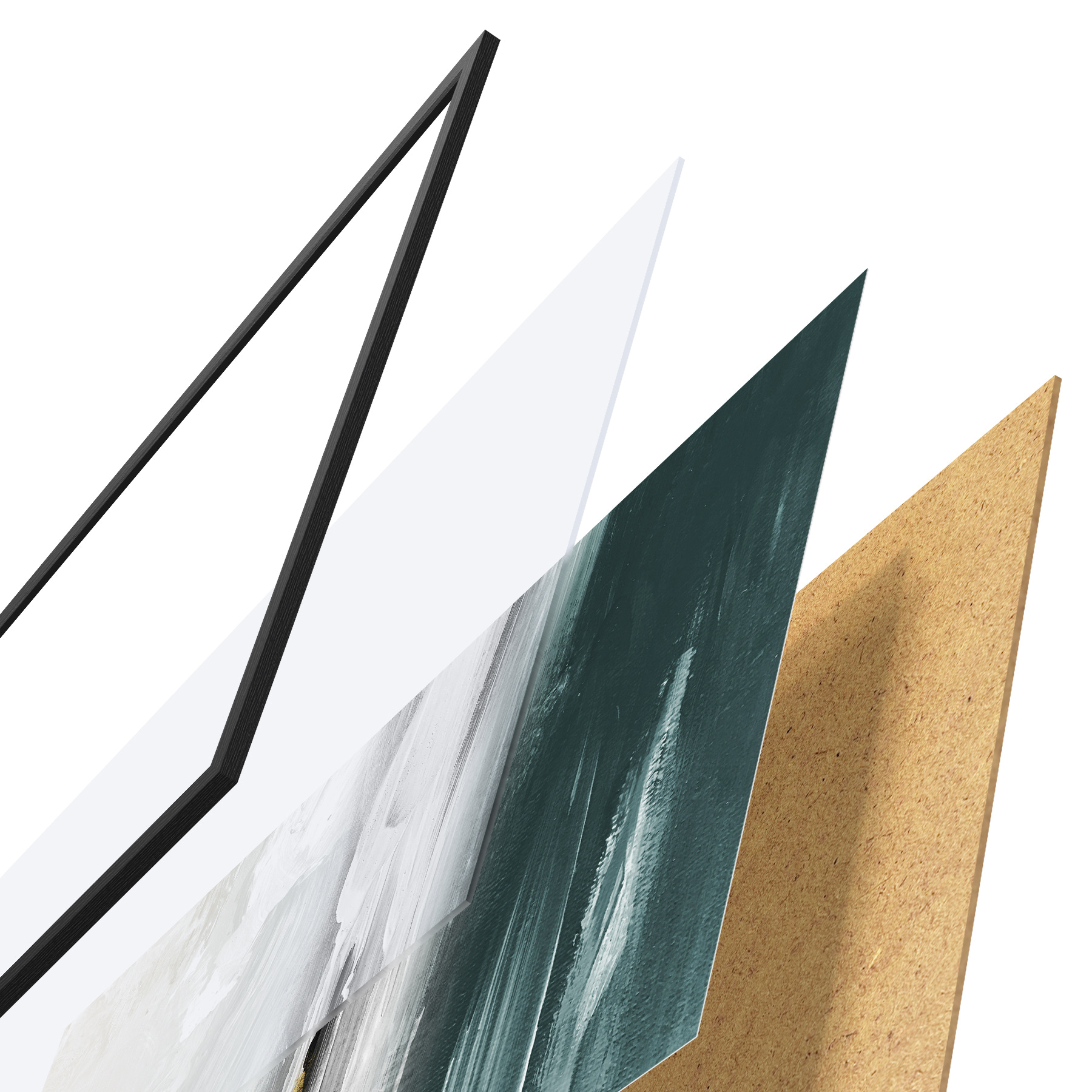 El póster consta de marco, plexiglás, imagen impresa y soporte de aglomerado. El póster puede colgarse inmediatamente en la pared gracias a los soportes de la parte posterior.