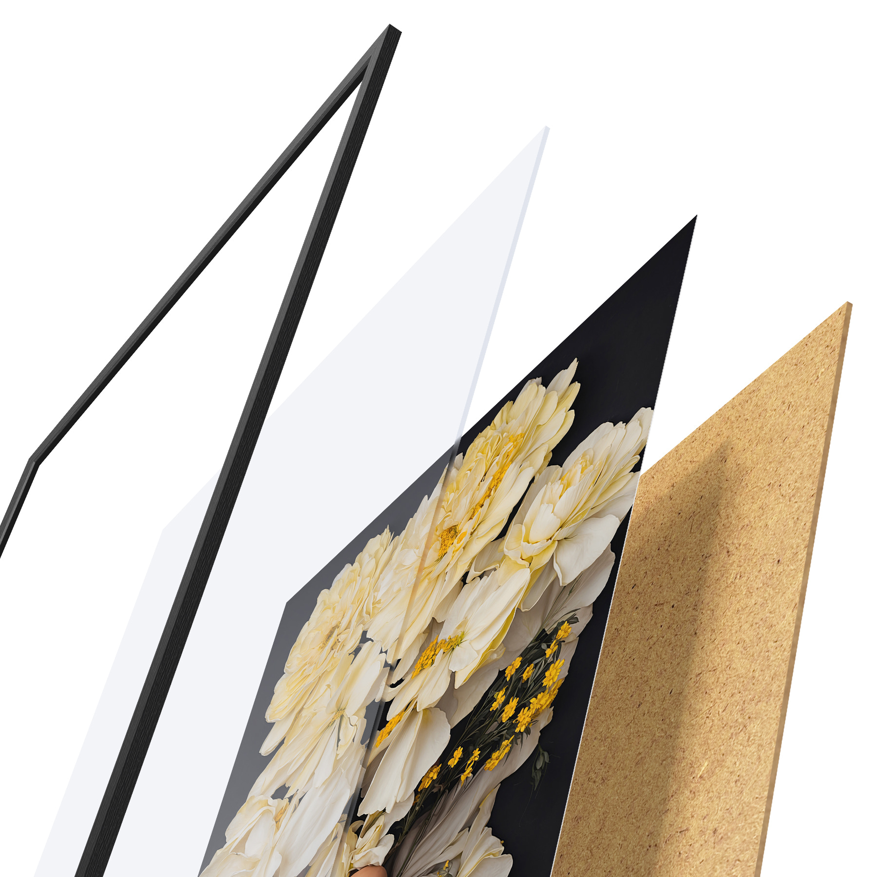 El póster consta de marco, plexiglás, imagen impresa y soporte de aglomerado. El póster puede colgarse inmediatamente en la pared gracias a los soportes de la parte posterior.