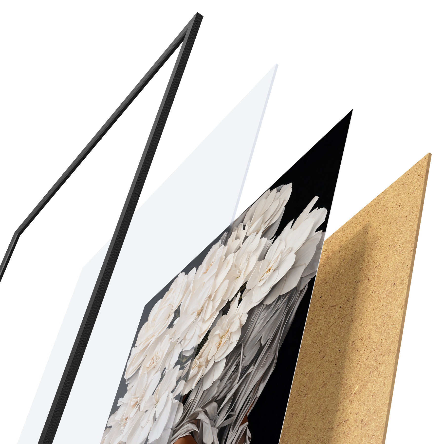 El póster consta de marco, plexiglás, imagen impresa y soporte de aglomerado. El póster puede colgarse inmediatamente en la pared gracias a los soportes de la parte posterior.