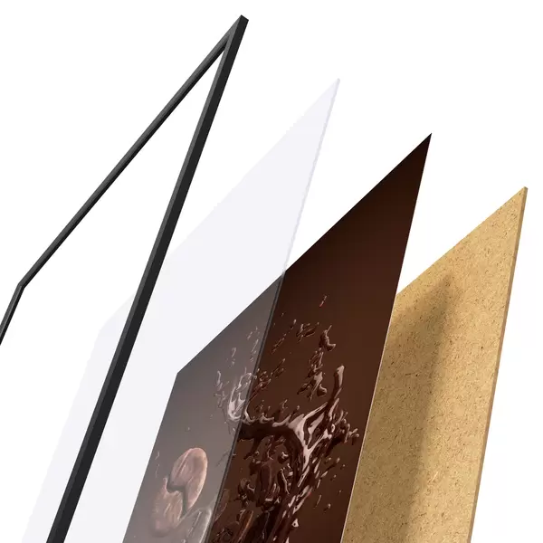 El póster consta de marco, plexiglás, imagen impresa y soporte de aglomerado. El póster puede colgarse inmediatamente en la pared gracias a los soportes de la parte posterior.