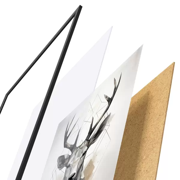 El póster consta de marco, plexiglás, imagen impresa y soporte de aglomerado. El póster puede colgarse inmediatamente en la pared gracias a los soportes de la parte posterior.