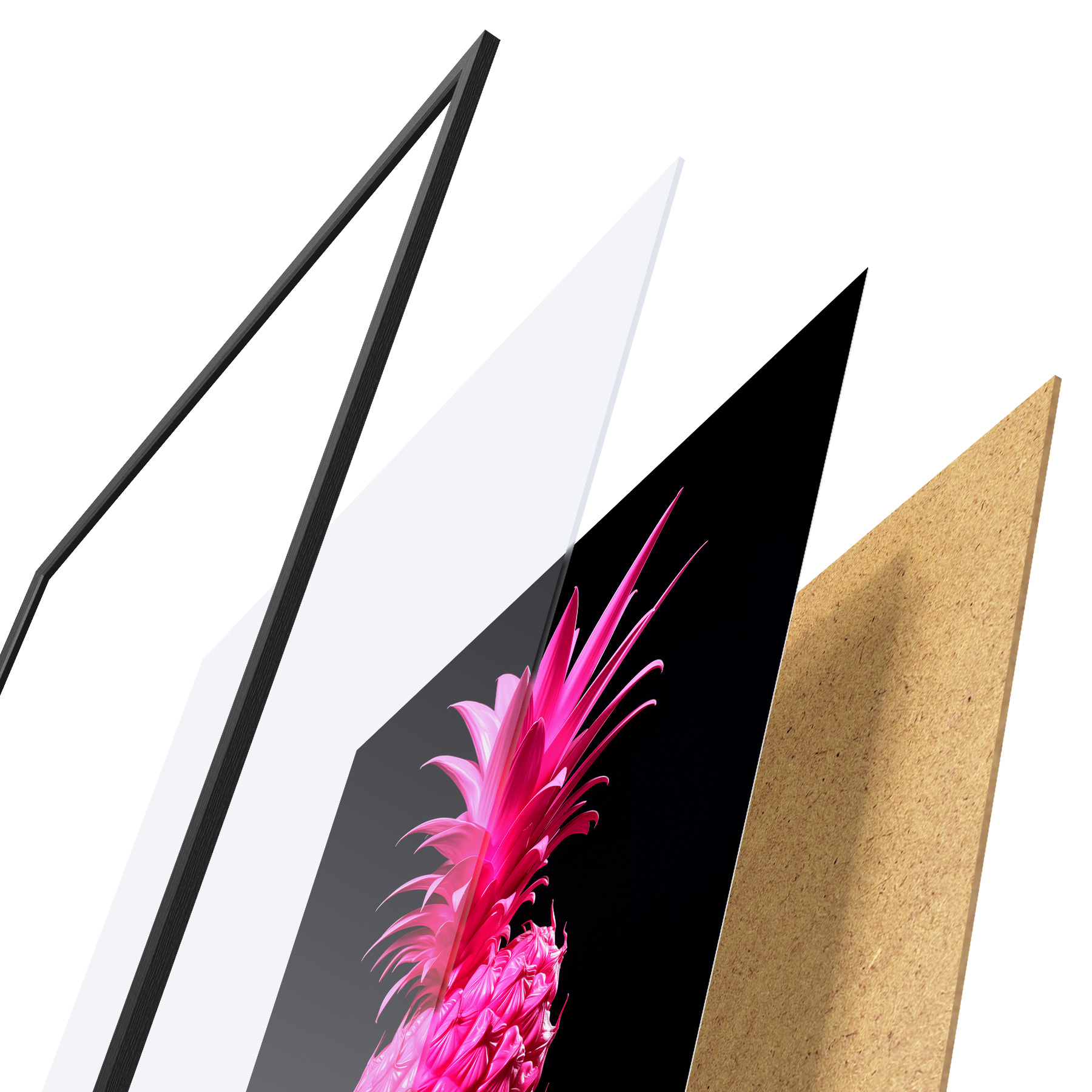 El póster consta de marco, plexiglás, imagen impresa y soporte de aglomerado. El póster puede colgarse inmediatamente en la pared gracias a los soportes de la parte posterior.