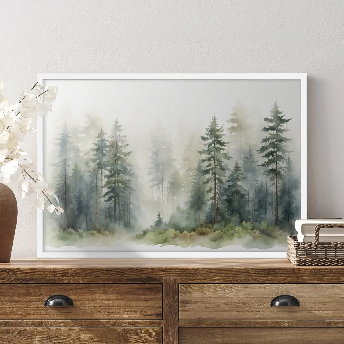 Poster Paisaje boscoso brumoso en tonos suaves f37337