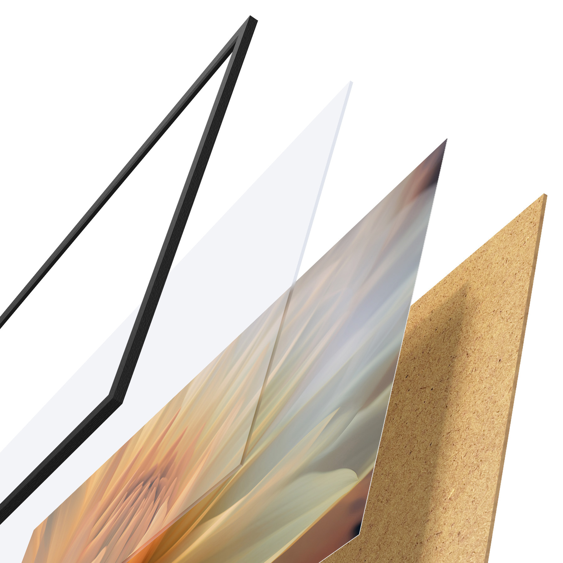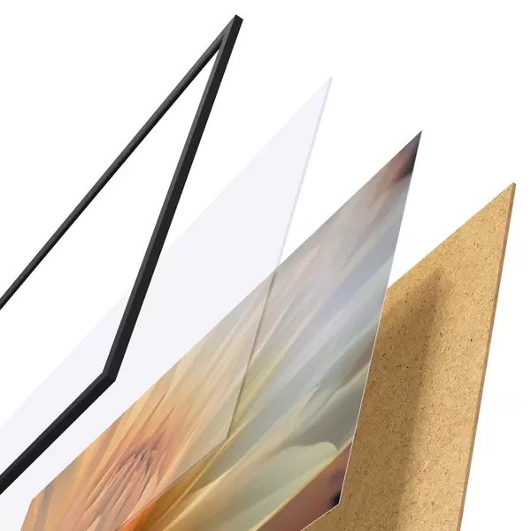 El póster consta de marco, plexiglás, imagen impresa y soporte de aglomerado. El póster puede colgarse inmediatamente en la pared gracias a los soportes de la parte posterior.