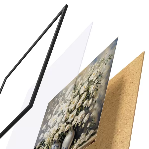 El póster consta de marco, plexiglás, imagen impresa y soporte de aglomerado. El póster puede colgarse inmediatamente en la pared gracias a los soportes de la parte posterior.