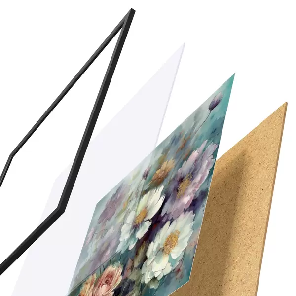 El póster consta de marco, plexiglás, imagen impresa y soporte de aglomerado. El póster puede colgarse inmediatamente en la pared gracias a los soportes de la parte posterior.