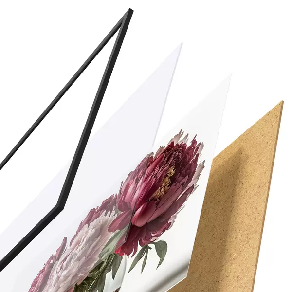 El póster consta de marco, plexiglás, imagen impresa y soporte de aglomerado. El póster puede colgarse inmediatamente en la pared gracias a los soportes de la parte posterior.
