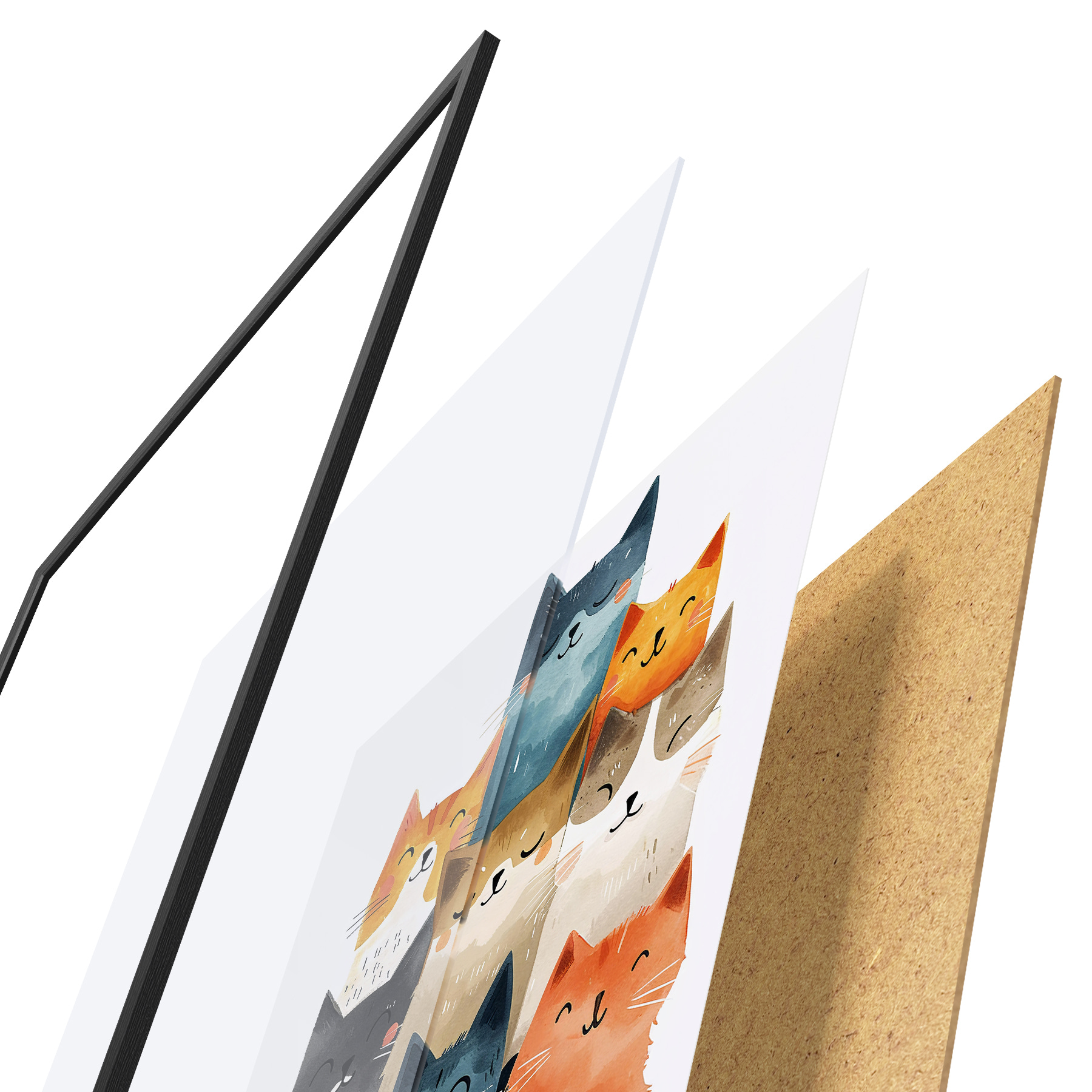 El póster consta de marco, plexiglás, imagen impresa y soporte de aglomerado. El póster puede colgarse inmediatamente en la pared gracias a los soportes de la parte posterior.