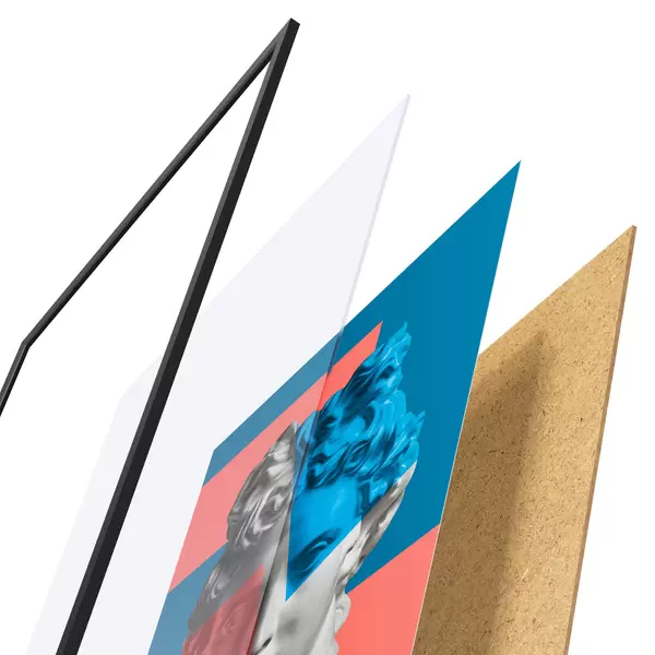 El póster consta de marco, plexiglás, imagen impresa y soporte de aglomerado. El póster puede colgarse inmediatamente en la pared gracias a los soportes de la parte posterior.