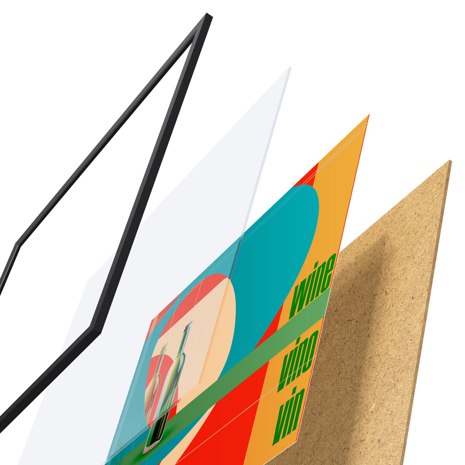 El póster consta de marco, plexiglás, imagen impresa y soporte de aglomerado. El póster puede colgarse inmediatamente en la pared gracias a los soportes de la parte posterior.