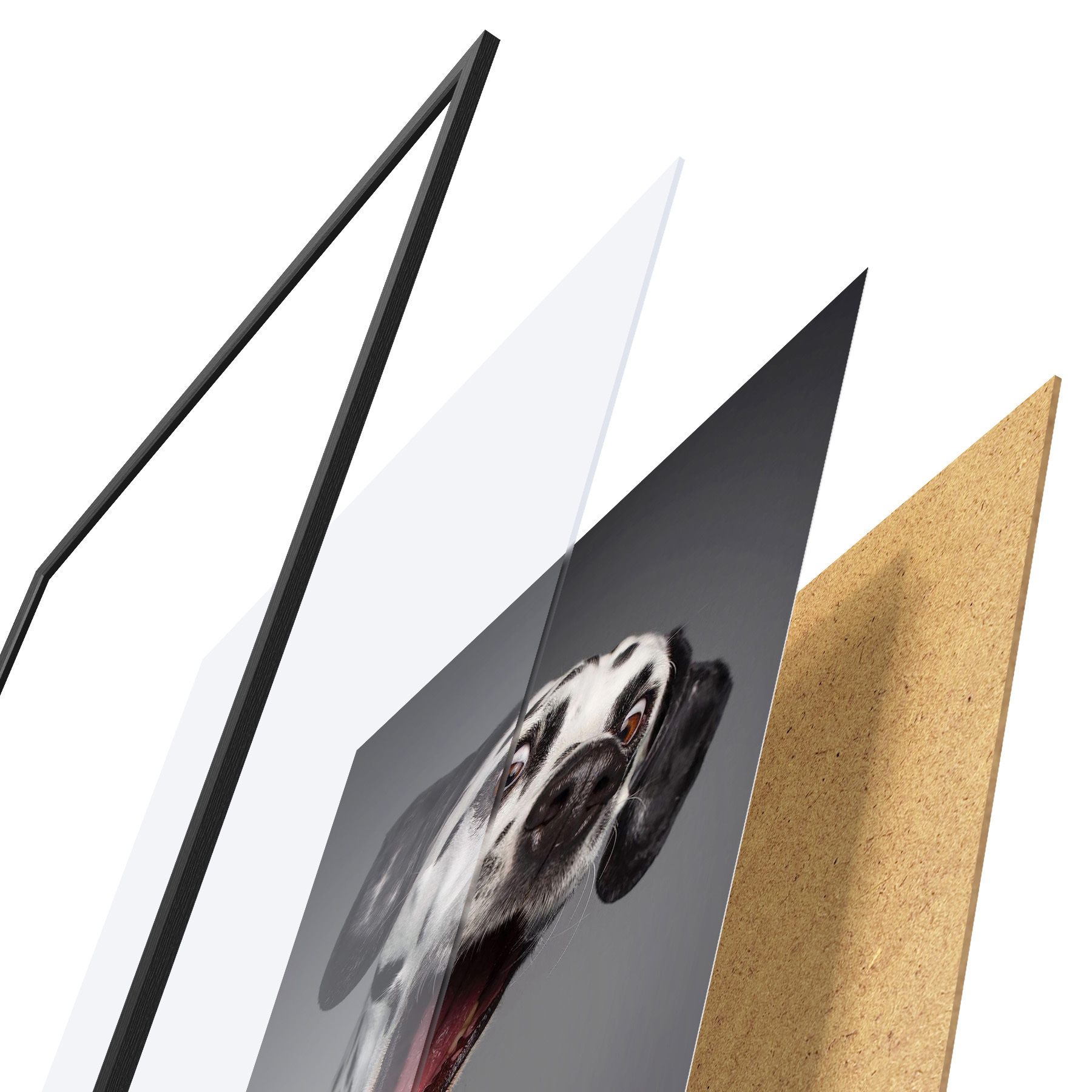 El póster consta de marco, plexiglás, imagen impresa y soporte de aglomerado. El póster puede colgarse inmediatamente en la pared gracias a los soportes de la parte posterior.