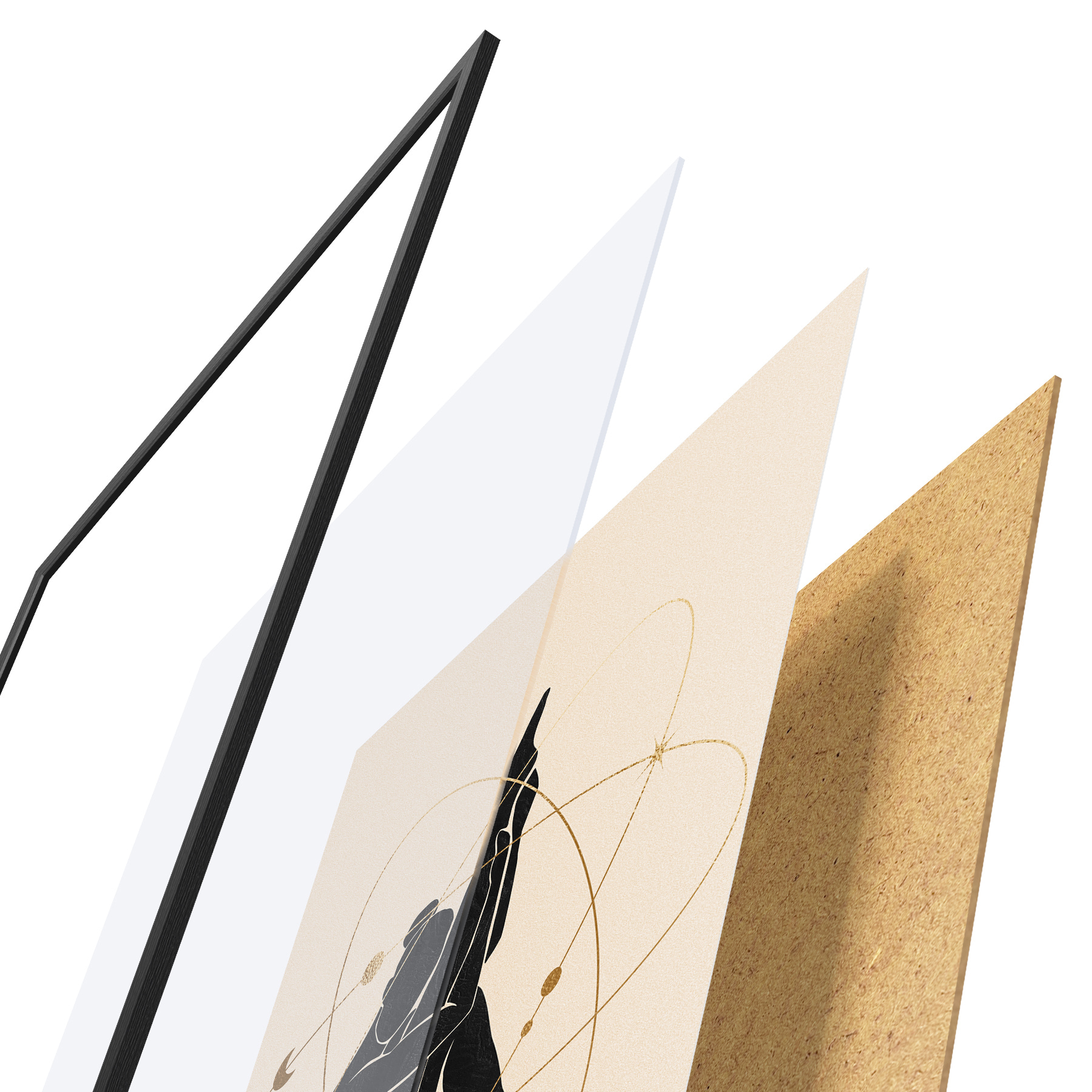 El póster consta de marco, plexiglás, imagen impresa y soporte de aglomerado. El póster puede colgarse inmediatamente en la pared gracias a los soportes de la parte posterior.