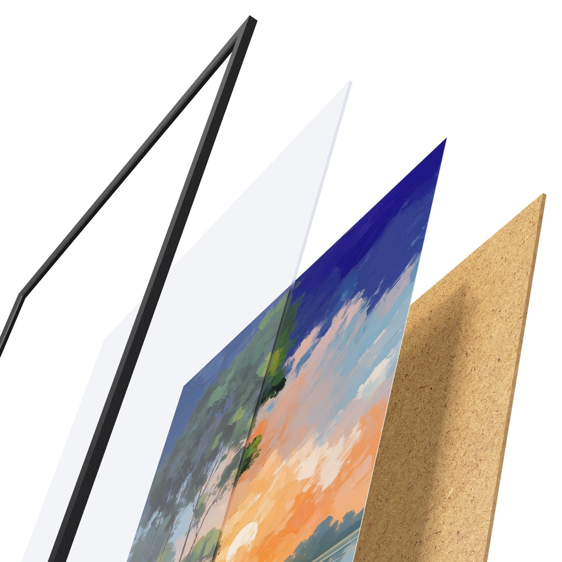 El póster consta de marco, plexiglás, imagen impresa y soporte de aglomerado. El póster puede colgarse inmediatamente en la pared gracias a los soportes de la parte posterior.