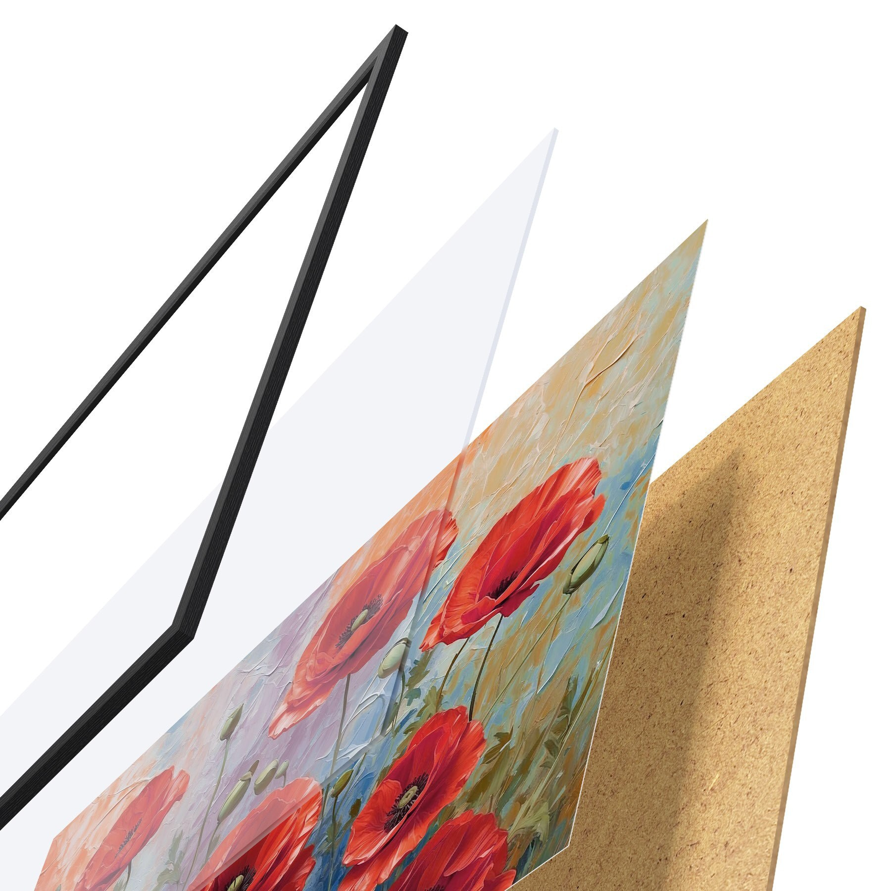 El póster consta de marco, plexiglás, imagen impresa y soporte de aglomerado. El póster puede colgarse inmediatamente en la pared gracias a los soportes de la parte posterior.