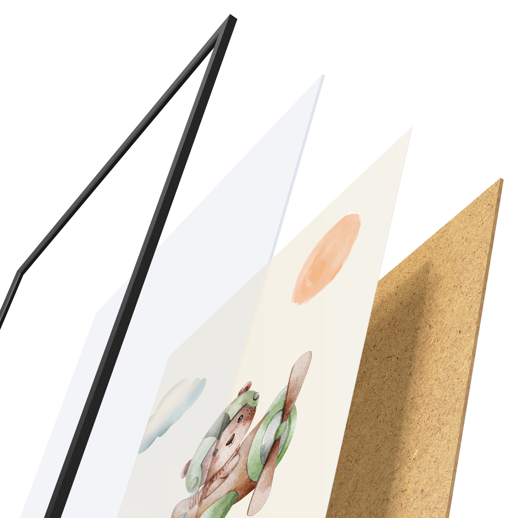 El póster consta de marco, plexiglás, imagen impresa y soporte de aglomerado. El póster puede colgarse inmediatamente en la pared gracias a los soportes de la parte posterior.