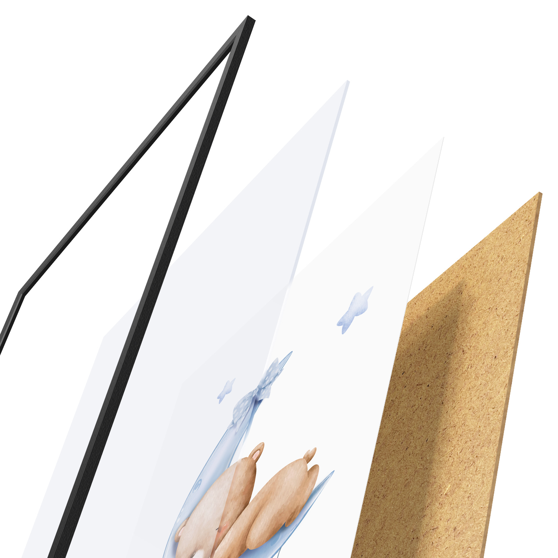 El póster consta de marco, plexiglás, imagen impresa y soporte de aglomerado. El póster puede colgarse inmediatamente en la pared gracias a los soportes de la parte posterior.