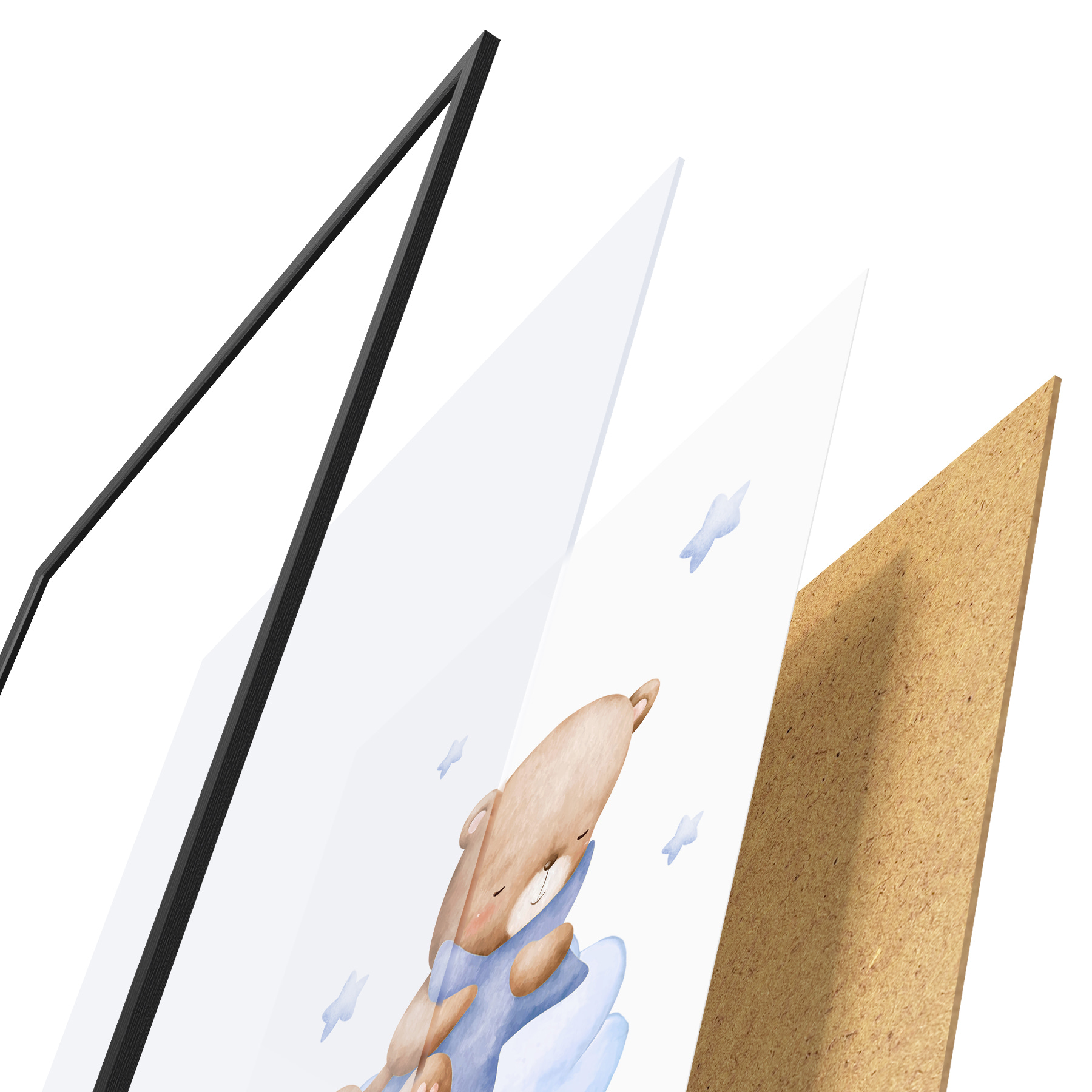El póster consta de marco, plexiglás, imagen impresa y soporte de aglomerado. El póster puede colgarse inmediatamente en la pared gracias a los soportes de la parte posterior.