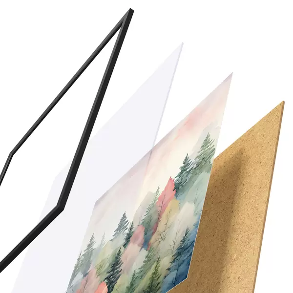 El póster consta de marco, plexiglás, imagen impresa y soporte de aglomerado. El póster puede colgarse inmediatamente en la pared gracias a los soportes de la parte posterior.