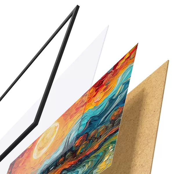 El póster consta de marco, plexiglás, imagen impresa y soporte de aglomerado. El póster puede colgarse inmediatamente en la pared gracias a los soportes de la parte posterior.