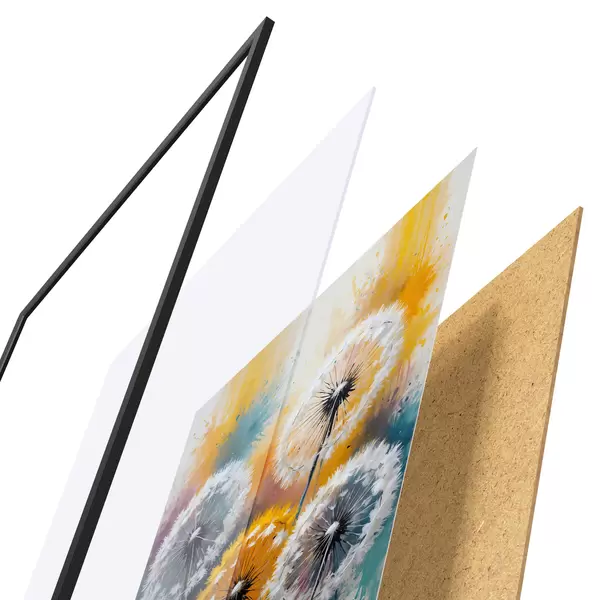 El póster consta de marco, plexiglás, imagen impresa y soporte de aglomerado. El póster puede colgarse inmediatamente en la pared gracias a los soportes de la parte posterior.