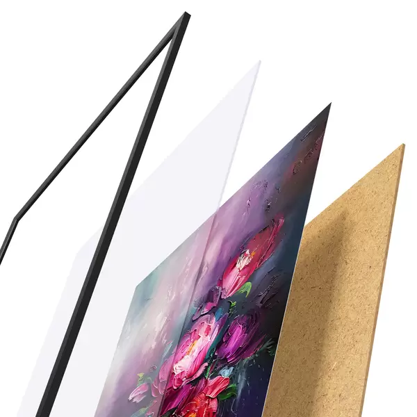 El póster consta de marco, plexiglás, imagen impresa y soporte de aglomerado. El póster puede colgarse inmediatamente en la pared gracias a los soportes de la parte posterior.