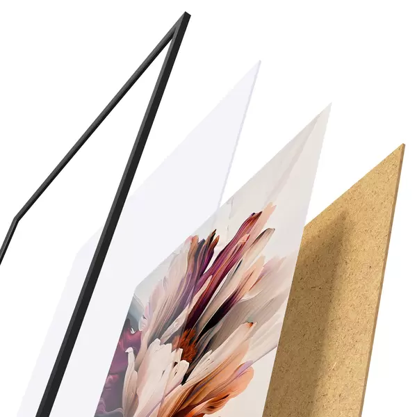 El póster consta de marco, plexiglás, imagen impresa y soporte de aglomerado. El póster puede colgarse inmediatamente en la pared gracias a los soportes de la parte posterior.